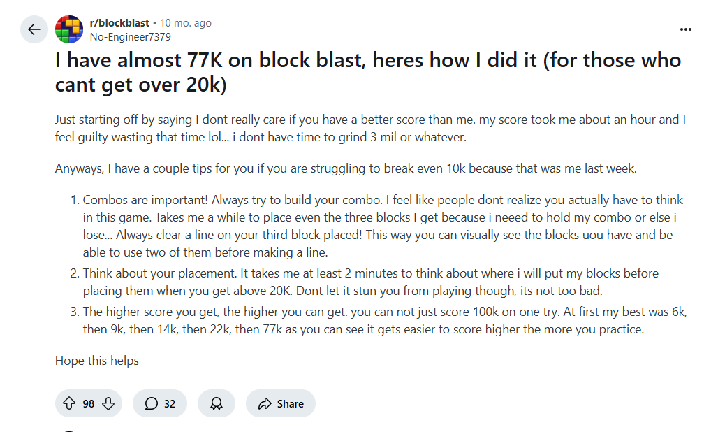 For many players, games like Block Blast serve as a form of stress relief. The simple, yet challenging gameplay can help players unwind after a long day, providing a relaxing break from the stresses of everyday life.